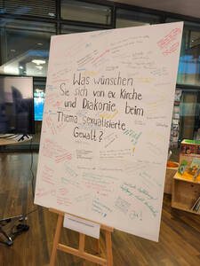 Am Informationsstand des BeFo auf der EKD-Synode werden Wünsche an Kirche und Diakonie ausgestellt, die auf dem Evangelischen Kirchentag 2025 in Hannover formuliert wurden. (Foto: Philipp Greifenstein)
