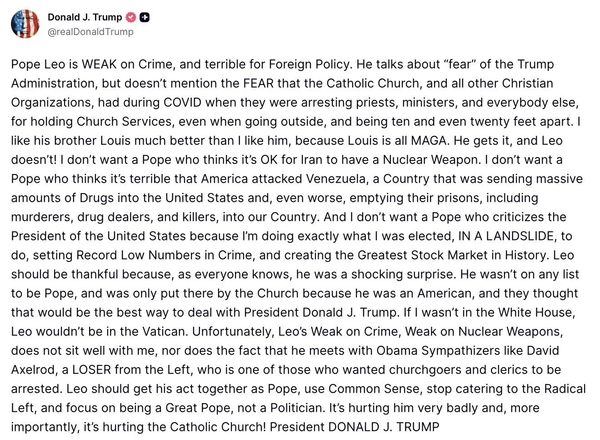 ich stecke ein wenig in der Bredouille. Das schlagzeilenbeherrschende religionspolitische Thema der Woche ist zweifellos der Konflikt von Donald Trumps „Make America Great Again“-Bewegung mit dem US-amerikanischen Papst Leo XIV., den Trump am Montag mit einer Tirade gegen den römisch-katholischen Pontifex Maximus weiter eskalierte.